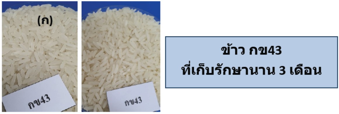 การเก็บรักษาข้าวเป็นเวลานาน จะทำให้เมล็ดข้าวสารมีสีคล้ำขึ้น ความขาวใสลดลง โดยเฉพาะการเก็บที่อุณหภูมิและความชื้นสูง เช่นเดียวกับเปอร์เซนต์ต้นข้าวจะมีปริมาณเพิ่มขึ้นเล็กน้อย เมื่อเก็บรักษานานขึ้น เปอร์เซ็นต์ต้นข้าวจะเกี่ยวข้องกับปริมาณข้าวเต็มเมล็ดเมื่อขัดสีเป็นข้าวสาร อย่างไรก็ตาม การเก็บรักษาในโรงเก็บที่ไม่เหมาะสมก็ส่งผลต่อการเข้าทำลายของโรคแมลง ซึ่งเป็นสาเหตุที่ทำให้เปอร์เซนต์ต้นข้าวลดลงได้ สำหรับเนื้อสัมผัสของข้าวที่เก็บรักษานานเมื่อหุงสุกพบว่ามีความแข็งมากกว่าข้าวเก็บเกี่ยวใหม่ เนื่องจากปริมาณ amylose และการรวมตัวของ amylose-lipid complex ในข้าว ทำให้เมล็ดมีความแข็งขึ้น Tulyathan and Leeharatanaluk (2007) ข้าวที่เก็บรักษานานหรือข้าวเก่าจึงต้องใช้อุณหภูมิในการหุงต้มให้สุกสูงกว่าและใช้เวลานานกว่า (Park et al., 2012) เช่นเดียวกับกลิ่นหอมในข้าวจะค่อยๆ ลดลง เมื่อเก็บรักษานานขึ้นโดยการเก็บรักษาที่อุณหภูมิสูงจะลดลงมากกว่าการเก็บรักษาที่อุณหภูมิต่ำ ตรงข้าวกับการเกิดกลิ่นหืนในข้าว เนื่องจากการเก็บรักษาข้าวในสภาพไม่เหมาะสมจะทำให้เกิดการ oxidation ของไขมันขึ้น ส่งผลให้เกิดกลิ่นหืนในข้าวที่เก็บรักษาเป็นเวลานาน (ธารารัตน์ และคณะ., 2563) เก็บรักษาข้าวเปลือกพันธุ์ กข21 กข43 กข45 กข77 กข79 พิษณุโลก80 นาน 10 เดือน ที่อุณหภูมิห้อง เมื่อนำมาสีเป็นข้าวสาร พบว่าข้าวจะมีสีคล้ำมากขึ้น เปอร์เซ็นต์ต้นข้าวพันธุ์ กข43 เพิ่มขึ้นเล็กน้อยในขณะที่พันธุ์อื่นๆ ไม่เปลี่ยนแปลง ข้าวสุกจะมีความแข็งเพิ่มมากขึ้นตามระยะเวลาการเก็บรักษา